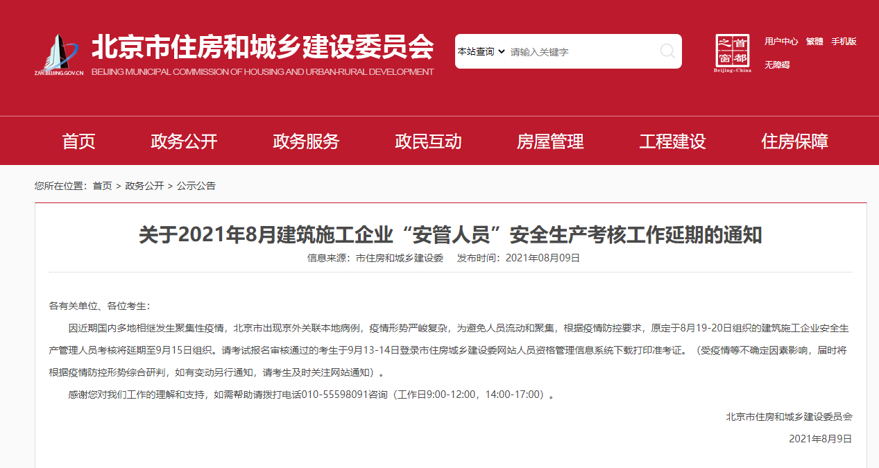 因近期国内多地相继发生聚集性疫情,北京市出现京外关联本地病例,疫情形势严峻复杂,为避免人员流动和聚集,根据疫情防控要求,原定于8月19-20日组织的建筑施工企业安全生产管理人员考核将延期至9月15日组织。请考试报名审核通过的考生于9月13-14日登录市住房城乡建设委网站人员资格管理信息系统下载打印准考证。(受疫情等不确定因素影响,届时将根据疫情防控形势综合研判,如有变动另行通知,请考生及时关注网站通知)。